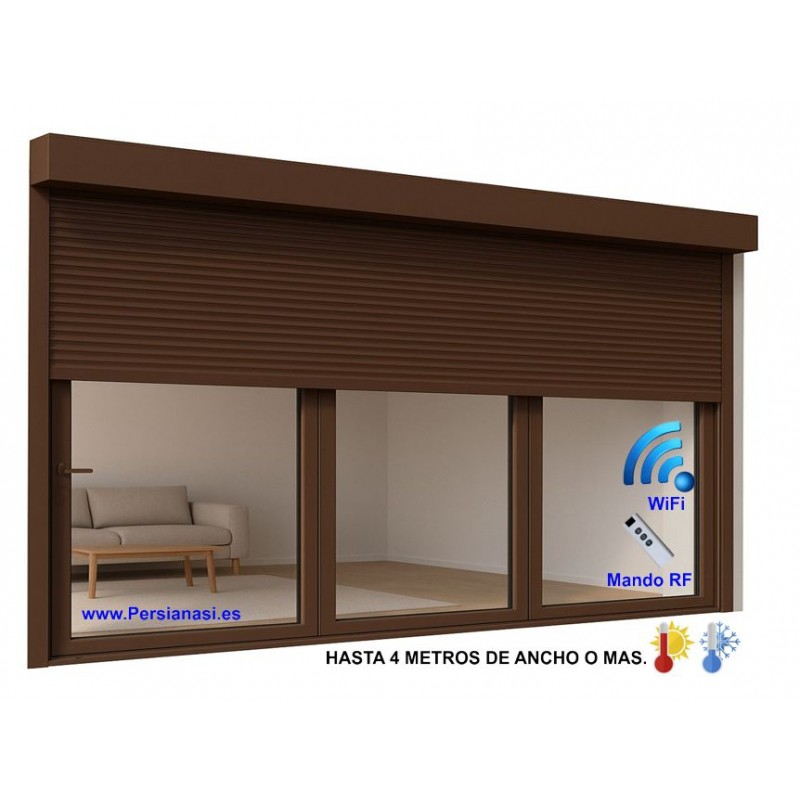 Persiana grande de hasta 4 metros. Persianas con cajón de gran tamaño de hasta 4 metros y 5 de alto. Instálate Persianas con cajón y motor de hasta 4 metros y podrás accionarlas también con tu móvil. Modelos normales y de gran tamaño. Podrás accionar la persiana desde el teléfono móvil o con un pulsador doble para persianas a motor. En las instrucciones se indica la App que debes usa. Pulsador normal-Pulsador táctil c/ wifi-Mando +receptor c/wifi. Estos modelos son compatible con los sistemas Alexa o Google home que moverán las persianas por voz. Las medidas mas grandes de persiana se envian con guias y zócalos superiores.